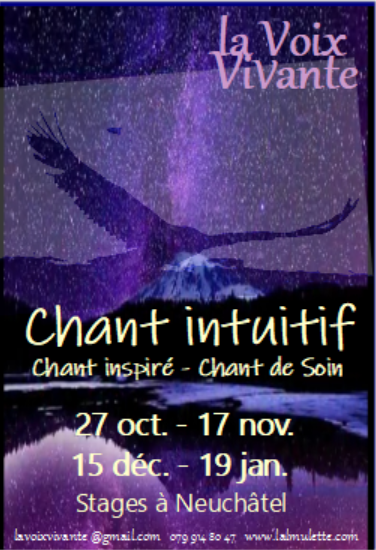 Le chant intuitif possède un grand pouvoir soignant, c’est qu’il est toujours authentique. Il n’y a pas à l’inventer, il s’inspire de ce qui est là en nous, ici et maintenant. Il nous traverse, nous libère, nous soigne, nous ouvre de nouveaux horizons, qu’il soit un chant de catharsis de notre égo encombré ou un chant connecté à la vastitude notre Être. Il nous enseigne l’écoute, la présence, le lâcher prise, l’accueil, l’observation, la conscience du souffle et du corps, la plénitude de l’instant présent.